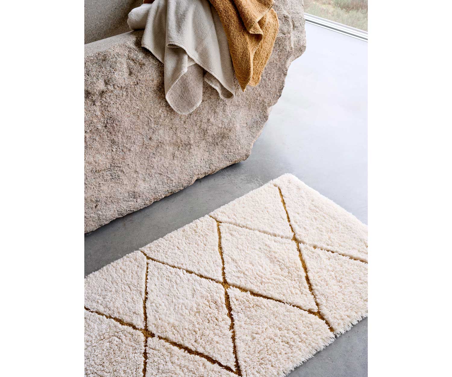 Hierzu passend die Handtuchfarben ecru col. 101 und gold col. 840 der verschiedenen Handtuch-Kollektionen von Abyss Habidecor.