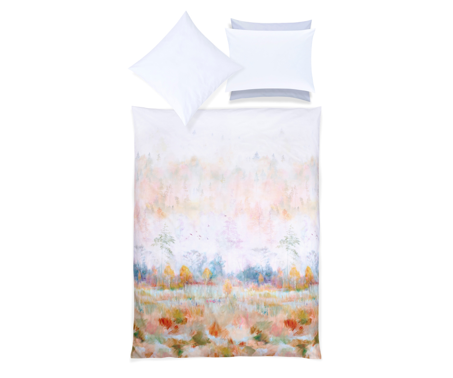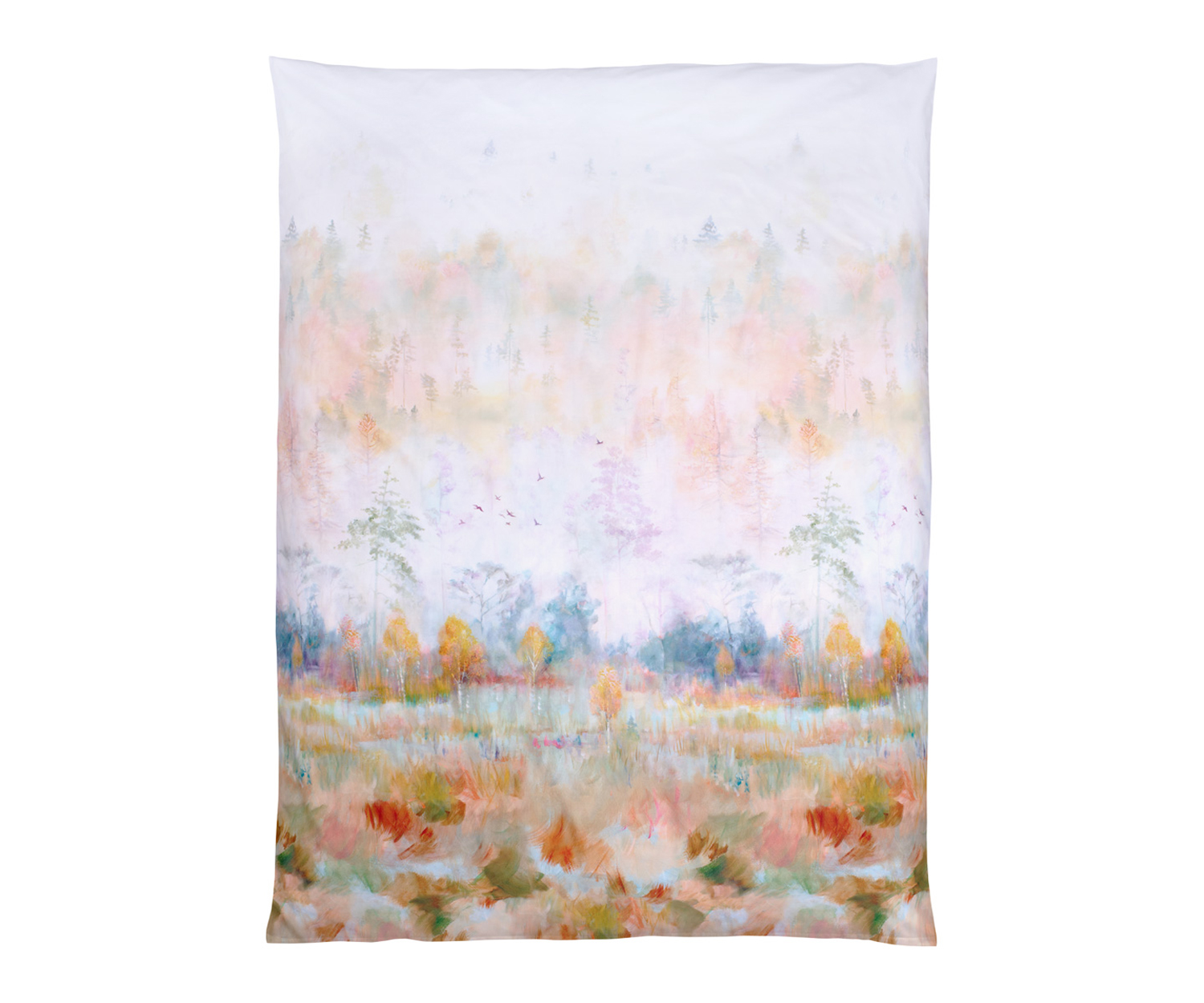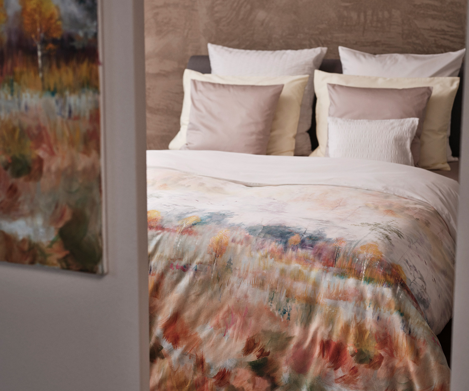 Zarte Nebelschwaden, schimmernde Blätter und ein Hauch von Poesie: Die im hauseigenen Atelier kunstvoll handgemalte Szenerie bringt natürliche Eleganz und stilvolle Ruhe in Ihr Schlafzimmer.