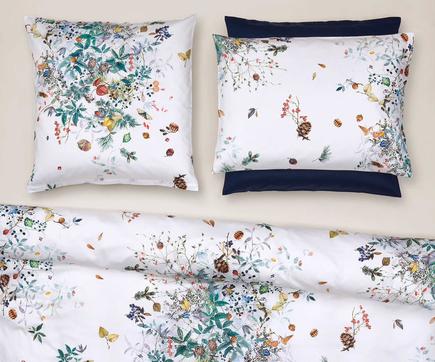 Lassen Sie sich davon bezaubern – vom Fischbacher Design WINTERWALD. Jedes Blatt und jede Beere wurde in St. Gallen von Hand aquarelliert und erstrahlt auf dieser zeitlos schönen Bettwäsche aus feinstem Baumwoll-Satin als wäre alles gerade erst auf den mit Schnee bedeckten Boden gefallen.